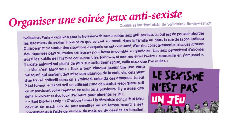 La Commission féministe de Solidaires Ile de France, avec Solidaires Paris, a organisé pour la troisième fois une soirée jeux anti-sexiste. Le but est de pouvoir aborder les questions de sexisme ordinaire que ce soit au travail, dans la famille ou dans la rue de façon ludique. Cela permet d’aborder des situations auxquels on est confronté, d’en rire collectivement mais aussi trouver des réponses plus ou moins sérieuses pour lutter ensemble au quotidien. Les jeux permettent d’aborder aussi les oublis de l’histoire concernant les femmes, et comme dirait l’autre « apprendre en s’amusant ».