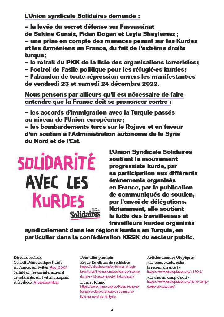 L’Union Syndicale Solidaires soutient le mouvement progressiste kurde, par sa participation aux différentes événements organisés en France, par la publication de communiqués de soutien, par l’envoi de délégations. Notamment, elle soutient la lutte des travailleuses et travailleurs kurdes organisés syndicalement dans les régions kurdes en Turquie, en particulier dans la confédération KESK du secteur public.